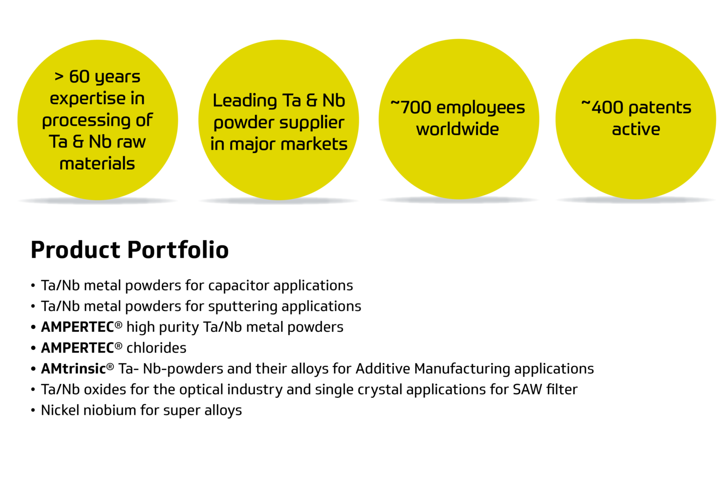 TANIOBIS is a member of JX Advanced Metals Corporation and converts metal ores and secondary materials into high-performance tantalum and niobium-based powders. Our company looks back at more than 60 years of experience in the development and manufacturing of high-performance metal powders for capacitors and for sputter targets; chemically highly pure oxides for the optical industry as well as other compounds such as chlorides, nickel niobium and oxalates. With one of the broadest tantalum product portfolio, we are one of the world’s leading suppliers of tantalum and niobium powders for applications such as: capacitors, semiconducting materials, and SAW devices. A highly qualified team of employees in R&D and application engineering develops industry- and custom- specific tantalum and niobium powders for a wide range of solutions for advanced applications.