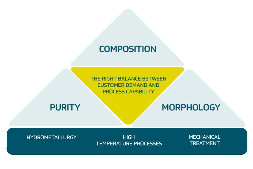 Our team can draw upon deep material knowledge, strong process expertise and unique equipment for hydrometallurgy, high temperature processes and mechanical treatments for development and production of tailor-made materials.